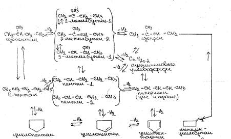 Схема основных и побочных химических превращений, протекающих при дегидрировании изопентана и изоамиленов (11):