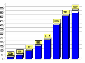 Количество пользователей Интернет на планете, на конец первого полугодия 2002 года, оценивается в пределах 400 - 560 млн. человек (6% - 9% населения). (см. Рис. 2.1.)