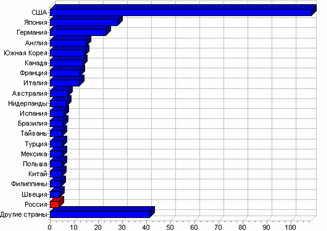Лидером по размеру регулярной интернет-аудитории являются США-108 млн. человек (25% мировой аудитории). Россия, с объемом населения в 144 млн. человек), занимает 20 место (см. Рис. 2.3.)