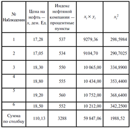 (в процентных пунктах). Требуется найти эмпирическую формулу, отражающую связь между ценой на нефть и индексом акций нефтяной компании исходя из предположения, что связь между указанными переменными линейна и описывается функцией вида