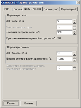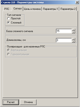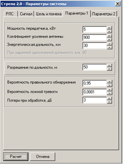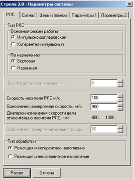 Расчет будем производить с помощью программы "Стрела". В окне параметров системы на пяти закладках даны параметры РЛС, которые можно изменять.