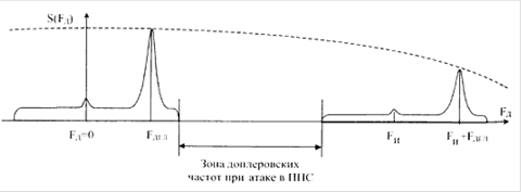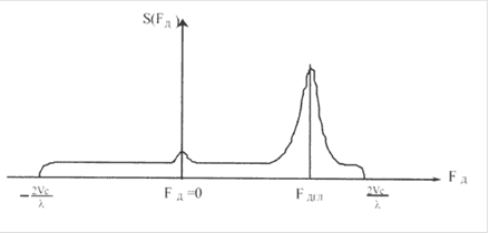Импульсно-доплеровские РЛС используют метод станций, работающих на непрерывном излучении. Спектр доплеровского сигнала, отраженного от поверхности земли с летящего объекта, представлен на рис.3 На нем значению мощности сигнала S (Fд) в области доплеровской частоты Fд = 0 соответствуют высотные отражения от точек подстилающей поверхности вблизи нормали, которая проведена с самолета на землю. Области частот Fдгл соответствуют отражению по оси луча антенны РЛС, скользящего по поверхности земли со скоростью перемещения самолета в горизонтальной плоскости.