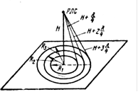 Для малых по сравнению с длиной волны и пологих неровностей применим метод возмущений (мелкомасштабная модель). Отраженная волна представляется в виде суммы волн от гладкой поверхности, определяемой коэффициентами отражения Френеля и обусловленной мелкими неровностями. Если радиус кривизны неровностей много больше длины волны (для плавных неровностей достаточно больших размеров), применим метод Кирхгофа (крупномасштабная модель). При этом отраженное поле вычисляется по законам геометрической оптики, т.е. так же, как при отражении от бесконечной касательной плоскости в данной точке поверхности. С учетом того, что в этой модели затенение одних участков поверхности другими отсутствует, можно воспользоваться коэффициентами отражения Френеля. При оценке участка гладкой поверхности, эффективно участвующего в формировании отраженного сигнала в сторону РЛС, можно воспользоваться зонами Френеля. Рассмотрим случай вертикального облучения земной поверхности. Метод построения зон ясен из рис.5.