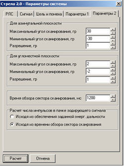 В закладке "Параметры 2" (рис.7) укажем для азимутальной плоскости: "Максимальный угол сканирования, гр." - 30, "Минимальный угол сканирования, гр." - (-30), "Разрешение, гр" - 1; для угломестной плоскости: "Максимальный угол сканирования, гр." - 2, "Минимальный угол сканирования, гр." - (-2), "Разрешение, гр" - 1; "Время обзора сектора сканирования, мс" - 1200 мс. Расчет числа импульсов в пачке зондирующего сигнала вести, исходя из времени обзора сектора сканирования.