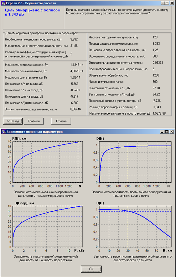 Далее программа выдает расчет параметров РЛС, используя введенные ранее данные (рис.8)
