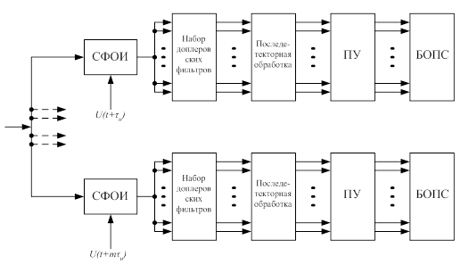 Согласованные фильтры одиночного радиоимпульса (СФОИ) стробируются по дальности с числом временных сигналов m. В каждом канале ставятся узкополосные доплеровские фильтры, перекрывающие доплеровский диапазон целей, где производится накопление сигнала. Детектирование огибающей сигнала осуществляется в блоке последетекторной обработки, на выходе которого в пороговом устройстве (ПУ) происходит сравнение с пороговым уровнем с целью обнаружения сигнала. В блоке определения параметров сигнала (БОПС) определяются параметры цели, такие как скорость, дальность и т.д.