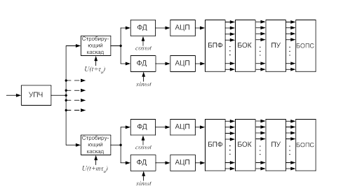 Стробирование по дальности выполняется в стробирующих каскадах, подключенных к выходу УПЧ, на которые подаются временные стробы длительностью τи. Количество стробирующих каскадов равно m.