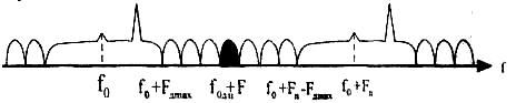 Применим импульсно-доплеровский метод с высокой частотой повторения (ВЧП) излучения зондирующих импульсов. Этот метод заключается в том, что выбирается частота повторения импульсов Fп большая, чем максимальная доплеровская частота цели. Периодически излучаемые зондирующие когерентные импульсы можно рассматривать как сумму гармонических составляющих с частотами fk = f0 + kFп, где f0 - несущая частота РЛС, a k - любое целое число. Каждая составляющая с частотой fk подобна непрерывному зондирующему сигналу, максимальное и минимальное доплеровское приращение частоты сигналов, отраженных от подстилающей поверхности, образуется как 2Vc/Ak и - 2Vc/Аk соответственно, где Аk= c/fk, а с - скорость распространения радиоволн. При этом, значение мощности доплеровского сигнала отражения от земли по каждой составляющей модулируется в соответствии с огибающей спектра зондирующих импульсов Sт. В результате этого спектр отраженного от земли доплеровского сигнала имеет вид, показанный на рис.4.