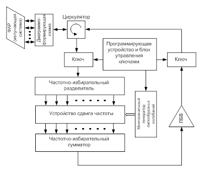 Может также использоваться последовательное соединение, когда данный входной сигнал сдвигается по частоте более чем один раз. Выходные сигналы всех каналов суммируются, усиливаются и излучаются в направлении подавляемого радиолокатора. Возможны девять основных вариантов программ создания помех по скорости, однако, когда они видоизменяются и используются в комбинации, число режимов становится еще большим: