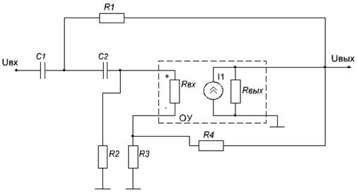Ознакомившись с заданием курсовой работы, я начал поиск данной схемы в различных источниках по аналоговой схемотехнике для того, чтобы понять, как она работает и определяются её параметры. В результате мне удалось найти данную схему, но оказалось, что в задании неправильно подключён ОУ. Поэтому я исправил эту ошибку, согласовав это с преподавателем, то есть с Вами.