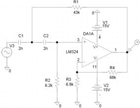При выборе элементов выбор пал на ряд Е24, так как это пятипроцентный ряд, что вполне достаточно для подобных схем. Операционный усилитель был заменен на другой, так как аналога, данного в задании, не оказалось в библиотеке программы PSpice.