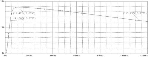 Построив АХЧ фильтра, видим, что он применим до частоты 114 кГц. Так как это верхняя частота для данной схемы. Именно поэтому был исключён четвёртый блок в схеме замещения для большого сигнала.