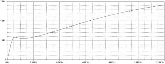 Как видим по АЧХ, этот фильтр имеет полосу пропускания в диапазоне, приблизительно, от 0 до 120 кГц, поэтому снимем частотные характеристики ещё раз на этом участке.