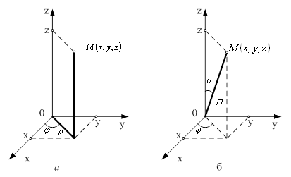 Рисунок 4 – Координати: а) циліндричні; б) сферичні