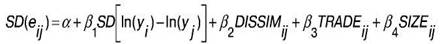 SD ln(yi)-ln(yj) - стандартне відхилення різниці логарифмів показника реального випуску країн i та j;