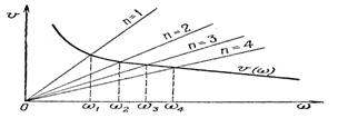 Многочастотность ЛБВ с внутренней обратной связью может быть пояснена также графически (рис. 7) путем сопоставления зависимости условия баланса фаз от частоты генерируемых колебаний с дисперсионной характеристикой замедляющей системы ЛБВ — v(w). Учитывая, что фазовые скорости прямой и отраженной волн практически одинаковы (vП = v0 = v) и намного меньше скорости света, а эквивалентная длина коаксиальных переходов на входе и выходе ЛБВ незначительна по сравнению с длиной спирали замедляющей системы (L << l ), зависимость условия баланса фаз от частоты генерируемых колебаний для разных п с достаточной степенью точности графически может быть представлена наклонными прямыми
