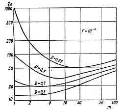 Как видно из рисунка, кривые q0(m) при D>0,5 имеют минимум при m=mопт(D), глубина которого увеличивается с увеличением вероятности правильного обнаружения. Соответственно увеличивается и выигрыш в пороговом отношении сигнал/шум (а следовательно, и в дальности обнаружения) при фиксированном числе частотных каналов по сравнению со случаем одночастотной работы. Вследствие этого при многочастотной работе при m