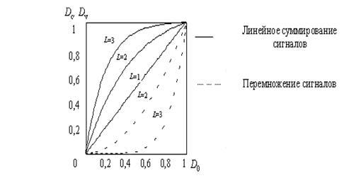 На рис. 11 графически изображена зависимость вероятности обнаружения цели в многоканальном приемнике с линейным суммированием сигналов от вероятности обнаружения цели в отдельном канале при различном числе каналов. Из сравнения графиков зависимости Dc=f(D0) при различных значениях L можно заключить, что вероятность обнаружения цели при линейном суммировании сигналов тем выше, чем больше число частотных каналов приемника. Однако не следует забывать, что увеличение числа каналов связано с повышением также и ложной тревоги. Чтобы сохранить вероятность ложной тревоги в многоканальном приемнике такой же, как в отдельном канале, необходимо увеличить порог, что, естественно, приведет к снижению вероятности обнаружения цели.