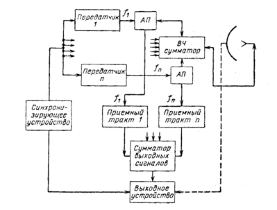 В РЛС первого типа имеется несколько передатчиков, работающих на различных частотах f1, f2, . . ., fn и запускаемых общим синхронизирующим устройством (рис. 12). Высокочастотные колебания поступают в волноводный сумматор и затем подводятся к облучателю зеркала антенны. Таким образом создается один луч, в пределах которого излучаются радиоволны различной длины. Принятые сигналы от антенны поступают к п приемникам, предназначенным для раздельной обработки сигналов на разных частотах.