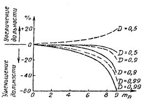 Рис. 13 Зависимость дальности действия десятичастотной РЛС от числа подавленных помехой рабочих частот
