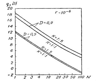 Рис. 14. Зависимости порогового отношения сигнал/шум в двухчастотной РЛС от числа импульсов N