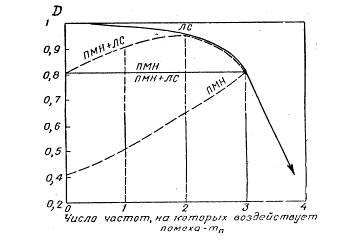Поскольку при воздействии помех на отдельных частотах РЛС с перемножением сигналов нет надобности в выключении соответствующих приемных каналов, вероятность обнаружения целей такой РЛС остается неизменной до тех пор, пока отсутствует помеха хотя бы на одной рабочей частоте РЛС (сплошная линия ПМН на рис. 15).