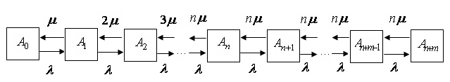 місць у накопичувачі зайняті, тобто заявка, що надходить в такий момент втрачається. Можна графічно на рис. (1) стрілками вказати усі переходи від стану до стану, а над стрілками ймовірності переходів за час