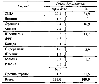 Большое влияние на развитие фондовых бирж на Западе оказало появление в 1970—1980-х годах производных ценных бумаг — деривативов, занявших заметное место в биржевом обороте ведущих фондовых бирж западных стран. В конце 1980-х годов их объем составил 12 трлн. долл., т.е. в 25 раз превысил объем всего товарооборота на мировом рынке. На начало 1997г. объем деривативов превысил 100 трлн. долл., а годовой мировой оборот, с их высокой скоростью, — 1000 трлн. долл. Распределение деривативов, согласно оценке Шиллеровского института в Германии, приведено в табл. 1.