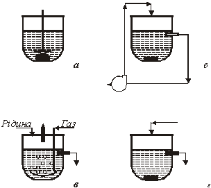Збільшенню швидкості перебігу процесу сприяє диспергування і перемішування фаз. Обидва прийоми підвищують швидкість перенесення компонентів системи до поверхні розділу фаз. Диспергування припускає попереднє подрібнення частинок твердої фази і введення газу в рідину через дисперсійні перегородки (наприклад, фільтр Шотта). Можливості диспергування небезмежні, і в лабораторних умовах одержати пил або міхур газу розміром істотно нижче 0,1 мм важко. Принципи перемішування очевидні з рис.1: мішалка (а), циркуляція (б), протока (в, г).