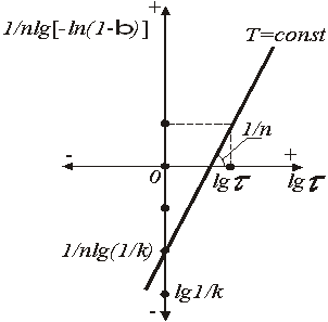 При побудові (рис. 3) графічної залежності (1/n)lg(-ln(1-β)) = f(lg τ) на ось ординат наносять значення lg(1/K), (1/n) lg (1/K) при lg τ = 0, потім проводять пряму лінію, тангенс кута нахилу якої дорівнює (1/n).
