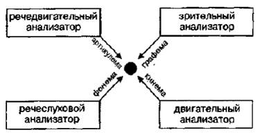 Овладение письменной речью представляет собой установление новых связей между словом слышимым и произносимым, словом, видимым и записываемым, т.к. процесс письма обеспечивается согласованной работой четырех анализаторов: речедвигательного, речеслухового, зрительного и двигательного.