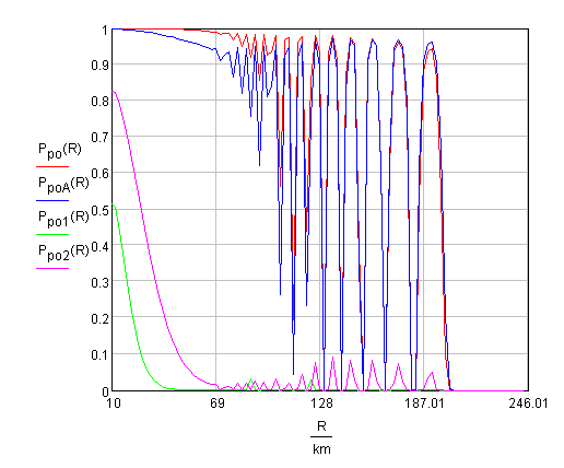 На рис. 2 приведены графики зависимости вероятности правильного обнаружения, рассчитанные по предложенной методике, в зависимости от дальности с учетом влияния кривизны Земли и затухания радиоволн при распространении в атмосфере при условии нахождении сигнала от цели и помехи одном разрешаемом объёме, где