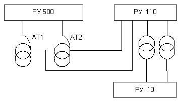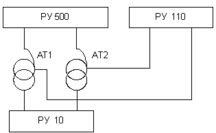 В схеме 1 шины распределительных устройств 500 киловольт и 10 киловольт соединены двумя автотрансформаторами АТДЦТН 500/110/10 АТ1 и АТ2. Питание шины 110 киловольт осуществляется с выводов среднего напряжения.