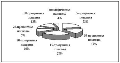 В настоящее время в России действующие ставки импортных пошлин на сельскохозяйственную продукцию и продовольствие существуют в пределах от 0 до 100%. Таможенными пошлинами не облагается лишь импорт чистопородных видов живых животных, живых животных для научно-исследовательских целей и субпродуктов животных для производства фармацевтической продукции. Более половины агропродовольственного импорта, поступившего в 2000 г., облагалось 5-процентной и 15-процентной пошлинами (Рис. 1).