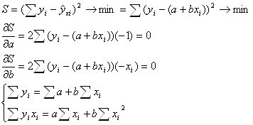 Уравнение вида (1) позволяет по заданным значениям фактора Х найти теоретическое значение результативного признака, представляя в уравнение фактическое значение фактора Х. построение линейной регрессии сводится к оценке этих параметров основан на методе наименьших квадратов (МНК) – позволяет получить также оценки параметров а и b при которых сумма квадратов отклонений теоретических значений результативного признака от фактического значения минимальна, т.е![]()