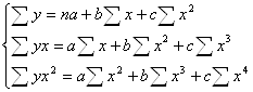 Сюда же можно отнести равностепенную гиперболу y=a+b/x. Ко второму типу относятся степенная, показательная, экспоненциальная функции. Полиномы любого порядка сводятся к линейной регрессии с ее методами проверки гипотез и оцениванием параметров. Параболу целесообразно применять для оцениваемого интервала значения фактора X, когда меняется характер среди исследуемых признаков. При этом применяется МНК для оценивания неизвестных параметров a,b,c. В результате получается система из 3 линейных уравнений с 3 неизвестными.