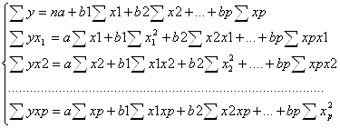 параметры уравнения множественной регрессии как и для парной регрессии находятся с помощью МНК. При его применении строится система нормальных уравнений, решение которых позволяет получить оценки параметров для уравнения множественной регрессии. Для уравнения множественной регрессии линейного вида получается система нормальных уравнений: