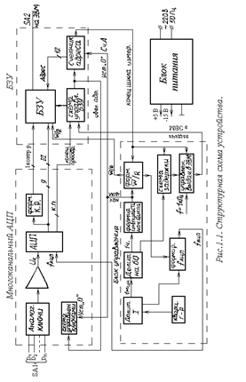 Многоканальный АЦП в течение заданного времени (время сбора информации 60 с) и с заданным периодом опроса (400 мс) преобразует аналоговую информацию в двоичный код и записывает эту информацию вместе с контрольным разрядом в БЗУ. После окончания цикла измерений формируется сигнал «Конец сбора информации», и устройство переходит в режим ожидания. Далее с вычислительного устройства поступают сигналы, по которым выдается хранимая информация.