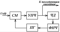 Упрощенная функциональная схема супергетеродинного приёмника, в котором для стабилизации промежуточной частоты сигнала используется система ЧАП, показана на рис.1. В этом приёмнике входной сигнал uc (t) преобразуется в смесителе (СМ) на промежуточную частоту, усиливается усилителем промежуточной частоты (УПЧ) и поступает на следующие каскады приёмника (детектор, УНЧ).