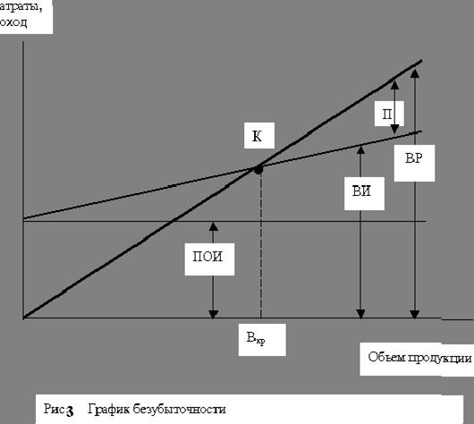 При построении графика по горизонтальной оси откладывается объем производства в единицах изделий или в процентах использования производственной мощности, а по вертикальной - затраты на производство и доход. Затраты откладываются с подразделением на постоянные (ПОИ) и переменные (ПИ). Кроме линий постоянных и переменных издержек, на графике отображаются валовые издержки (ВИ) и выручка от реализации продукции (ВР).
