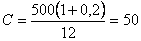 Так, для годового кредита на сумму 500 руб. по ставке 20% годовых, погашаемых 12 ежемесячными платежами, каждый платеж