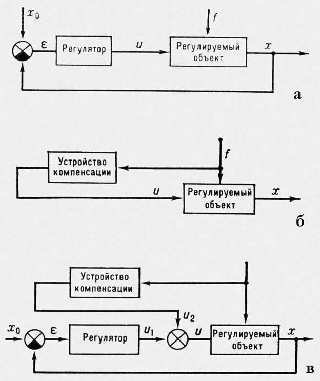 Регулирование автоматическое (от нем. regulieren — регулировать, от лат. regula — норма, правило), поддержание постоянства (стабилизация) некоторой регулируемой величины, характеризующей технический процесс, либо её изменение по заданному закону (программное регулирование) или в соответствии с некоторым измеряемым внешним процессом (следящее регулирование), осуществляемое приложением управляющего воздействия к регулирующему органу объекта регулирования; разновидность автоматического управления. При автоматическом регулировании управляющее воздействие u(t) обычно является функцией динамической ошибки — отклонения e(t) регулируемой величины х(t) от её заданного значения x0(t): e(t) = x0(t) — х(t) (принцип Ползунова — Уатта регулирования по отклонению, или принцип обратной связи) (рис. а). Иногда к автоматическому регулированию относят также управление, при котором u(t) вырабатывается (устройством компенсации) в функции возмущающего воздействия f (нагрузки) на объект (принцип Понселе регулирования по возмущению) (рис. б), и комбинированное регулирование по отклонению и возмущению (рис. в).