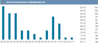 На начало 2011 г. на рынке обращалось 95 выпусков на сумму 424 881 млн. руб., что указывает на уменьшение выпусков на 9% в сравнении с началом 2010 г. (рис. 2).