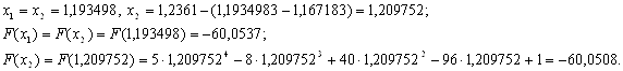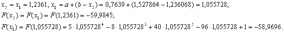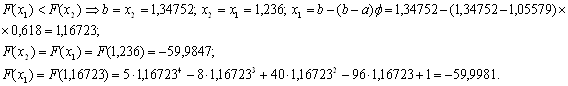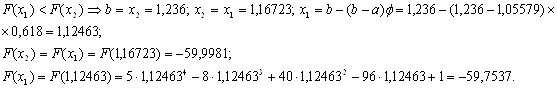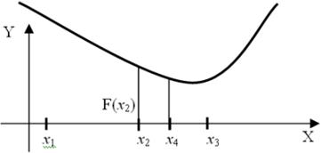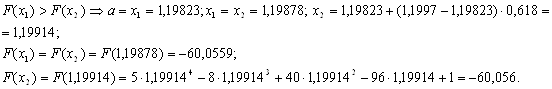 Потім обчислюють значення функції в цих точках y1=f(x1) і y2=f(x2) і в залежності від їх співвідношення нові межі відрізка унімодальності (a1, 1) будуть наступні: