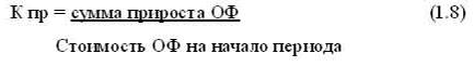 Прирост основных фондов - это увеличение их в натуральном выражении (накопление). В абсолютной сумме прирост определяется как разница между объемом основных фондов на начало и конец периода или как разница между их поступлением и выбытием за период. В относительном выражении прирост основных фондов определяют как отношение абсолютной величины прироста за период к их стоимости на конец периода. Обновление основных фондов - это модернизация и замена функционирующих средств труда новыми, более производительными и совершенными по техническому уровню Количественно обновление измеряется с помощью: коэффициента обновления и коэффициента выбытия основных фондов.