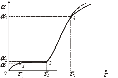 досить висока оскільки перетворення протікає на первинній поверхні, яка має найбільший розмір. Потім швидкість перетворення сповільнюється й в індукційному періоді (ділянка 1–2) воно протікає із меншою швидкістю
