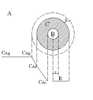 Так як шар твердої речовини вчинює опір руху речовини А, то концентрація його біля ядра