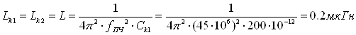 рівні й вибираються з діапазону 200 – 250 пФ.Візьмемо їхню ємність 200 пФ. Індуктивності контурів також рівні й обчислюються по формулі: