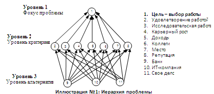 1. Перейдем к декомпозиции нашей проблемы. Пусть наша цель – выбор оптимального места работы. Исходя из собственных знаний и опыта, были отобраны три наиболее предпочтительных варианта: Банк, ИТ - компания, Свое дело (варианты А, В, С), которые и были исследованы. Для выбора окончательного варианта используем метод анализа иерархий (МАИ). Итогом первого этапа МАИ, стала следующая иерархия (см. иллюстрацию №1):