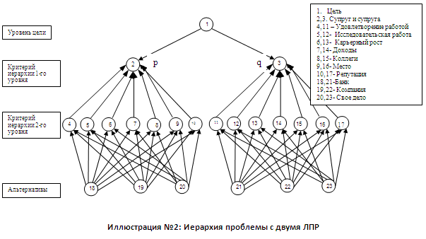 Величины р и q на первом иерархическом уровне представляют собой весовые коэффициенты, которые приписываются точке зрения супруга и супруги относительно процесса выбора соответственно. Второй иерархический уровень использует веса (р1, р2,…) и (q1, q2,….) для отображения индивидуальных точек зрения пары относительно заданных критериев. Остальная часть структуры принятия решения может быть интерпретирована аналогично предыдущему примеру. Заметим, что: